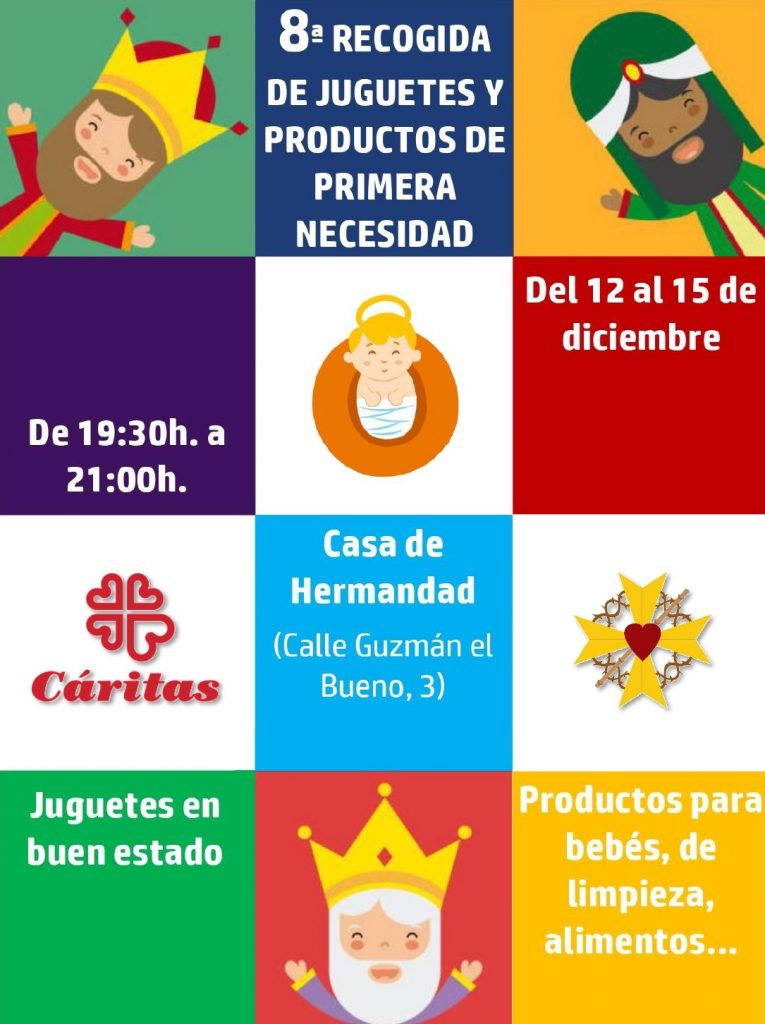 La recogida se realizará del 12 al 15 de diciembre, de 19:30h. a 21:00h., en nuestra casa de hermandad (calle Guzmán el Bueno, nº3) y todo lo que se recoja será entregado a Cáritas.