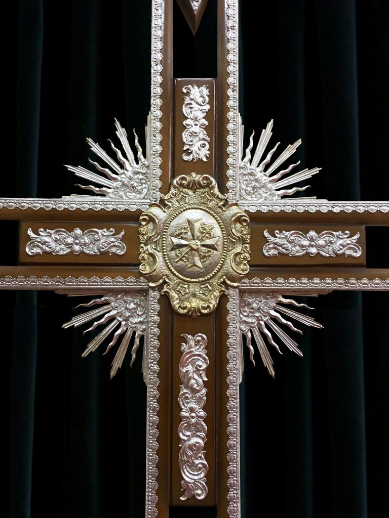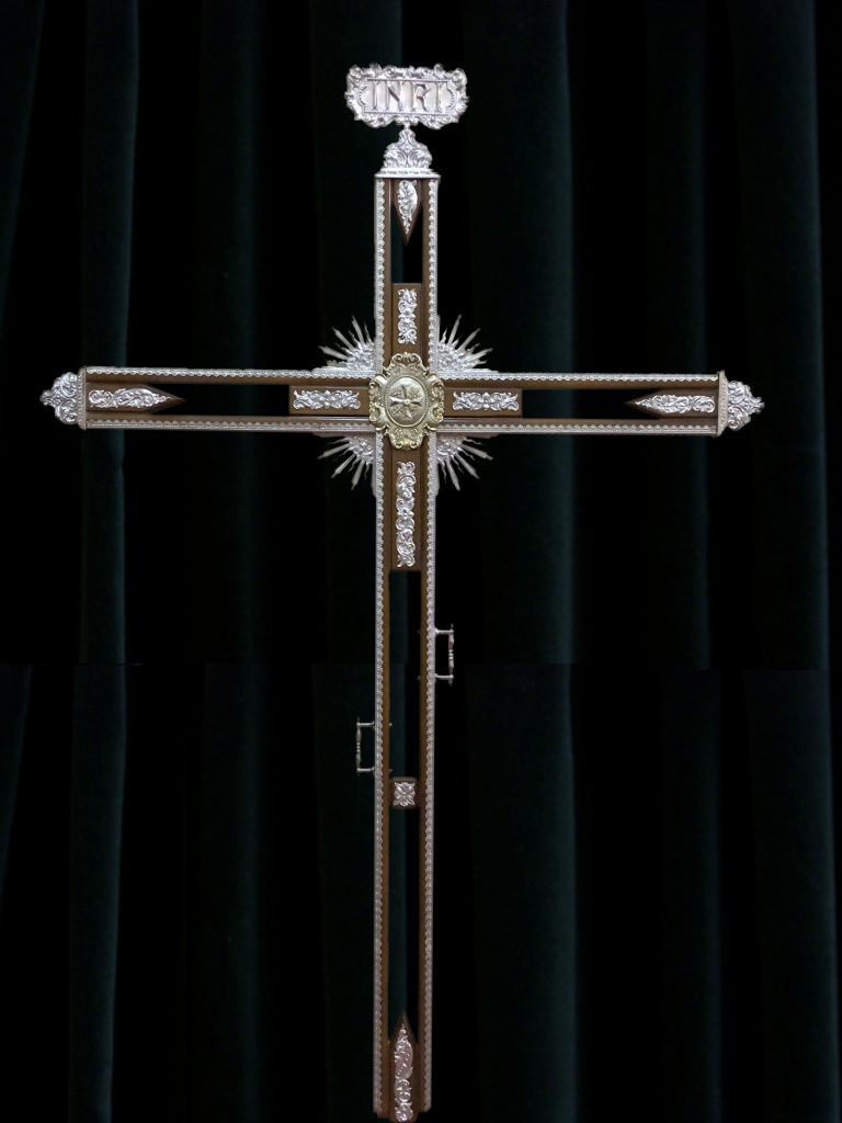 La cruz de guía fue diseñada por el aspense Pedro Pastor Barrachina. La madera de la misma, fue realizada por el también aspense Pedro Pastor mientras que la orfebrería corrió a cargo de Orfebrería Sevillana (Sevilla).