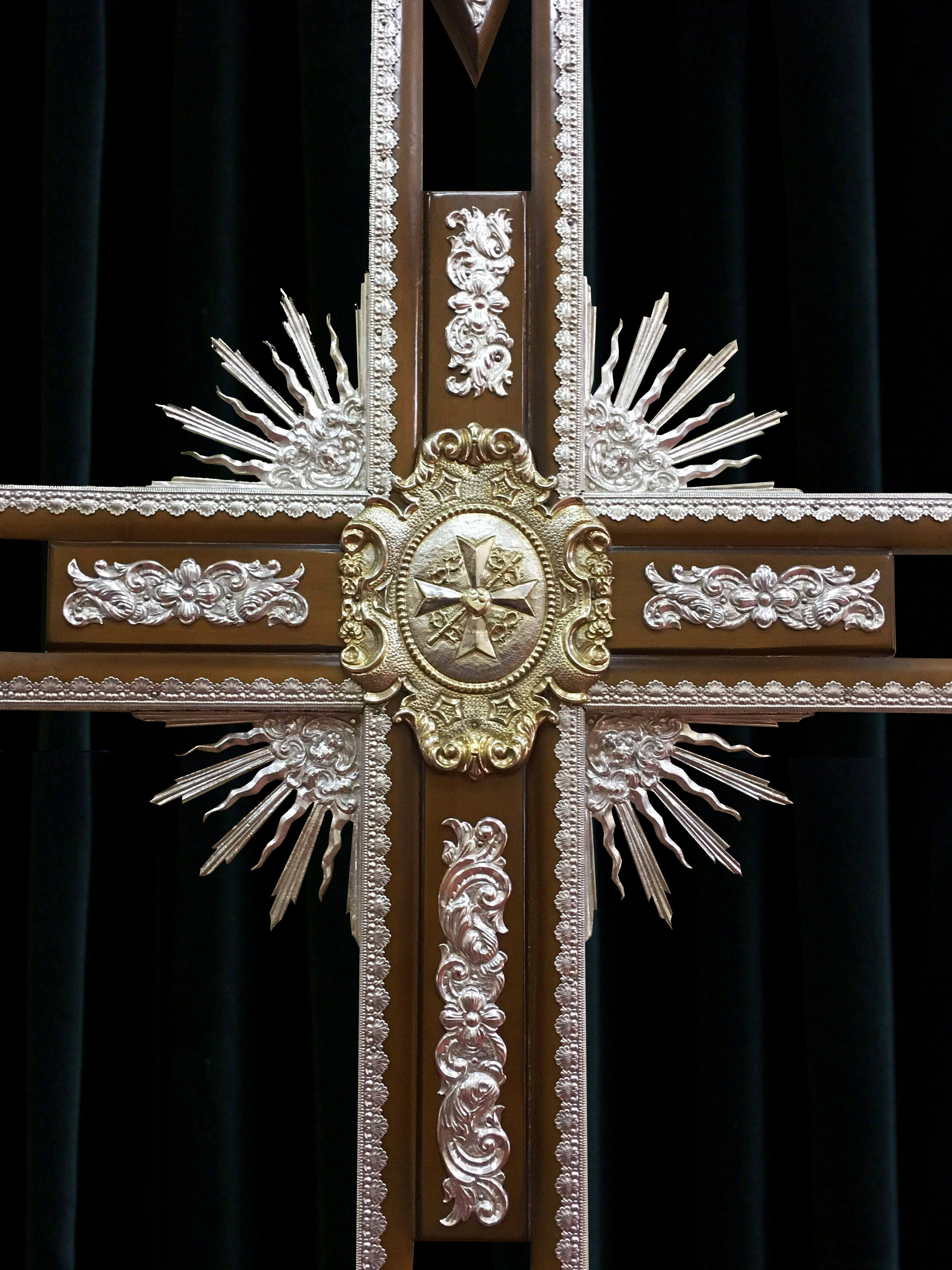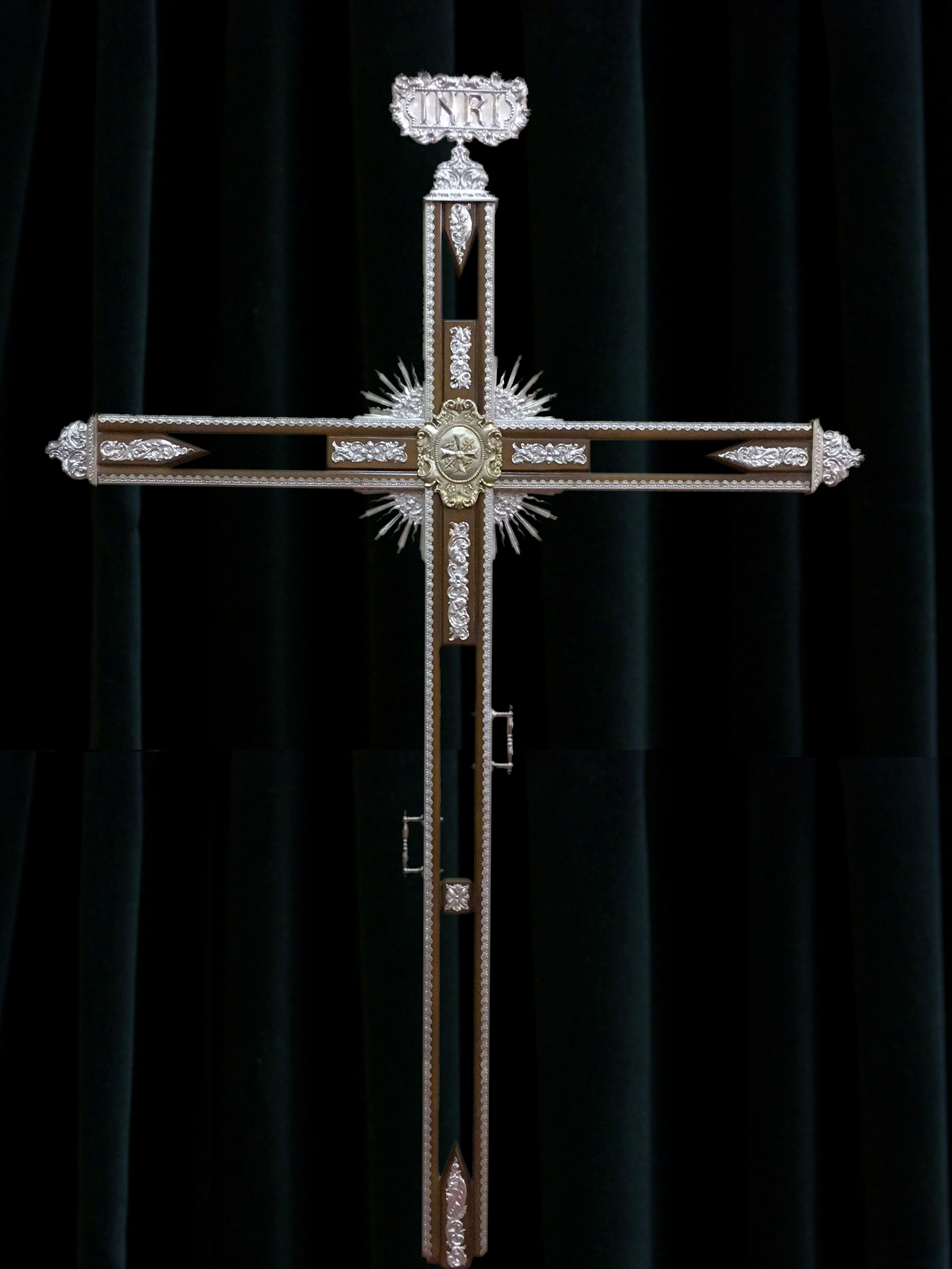 La cruz de guía fue diseñada por el aspense Pedro Pastor Barrachina. La madera de la misma, fue realizada por el también aspense Pedro Pastor mientras que la orfebrería corrió a cargo de Orfebrería Sevillana (Sevilla).