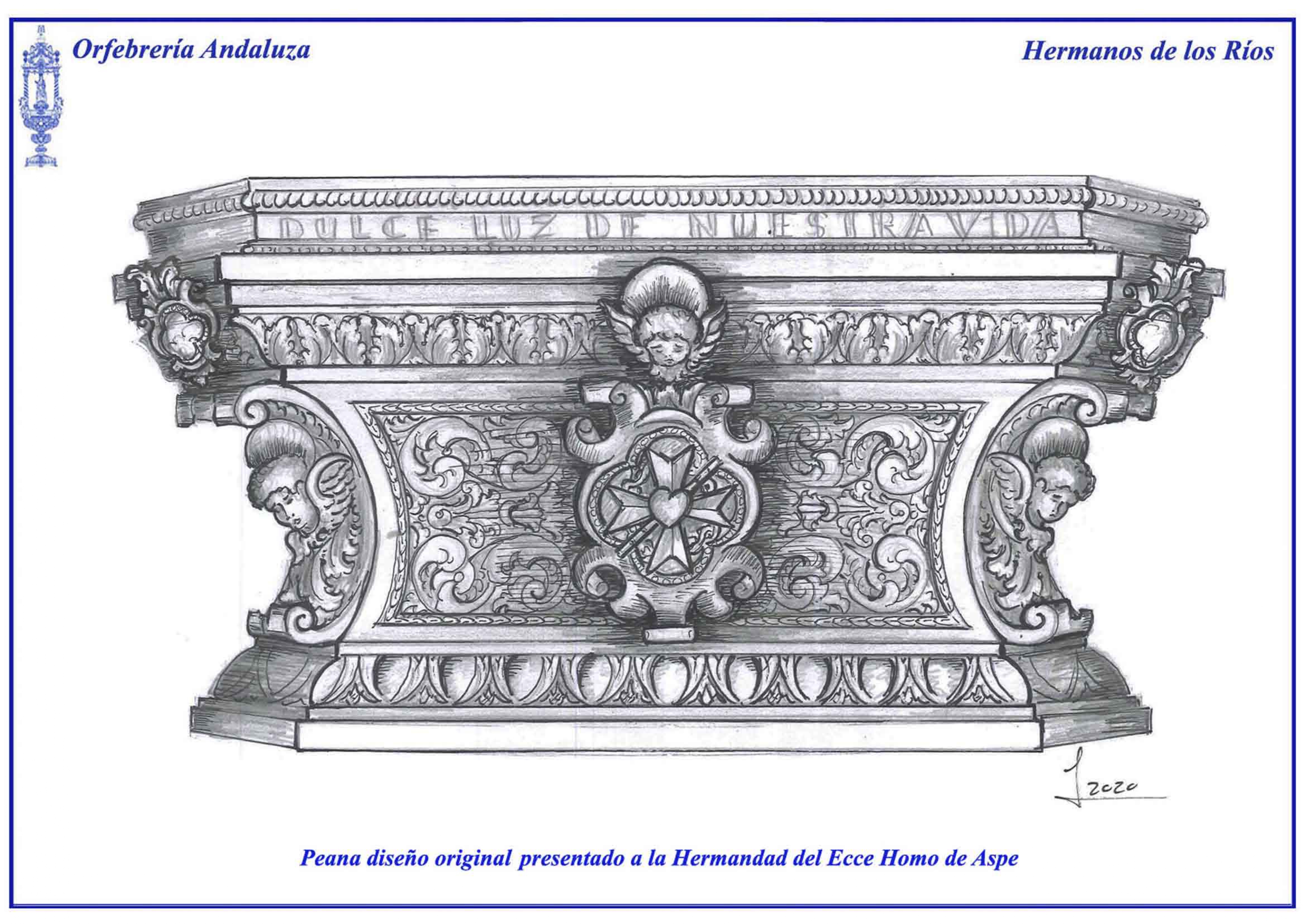 La peana, que será labrada en alpaca plateada siguiendo el estilo barroco del proyecto del paso de palio, siendo su arquitectura ochavada en sus esquinas, con el cuerpo en forma de cuello de cisne.
