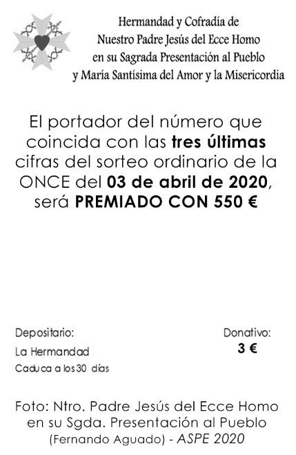 El portador del número que coincida con las tres últimas cifras del sorteo diario de la ONCE del 5 de agosto de 2020, será premiado con 550€. Las estampitas pueden ser adquiridas con un donativo de 3€. Si quieres hacerte con la tuya ponte en contacto con nosotros o con cualquier miembro de la hermandad.