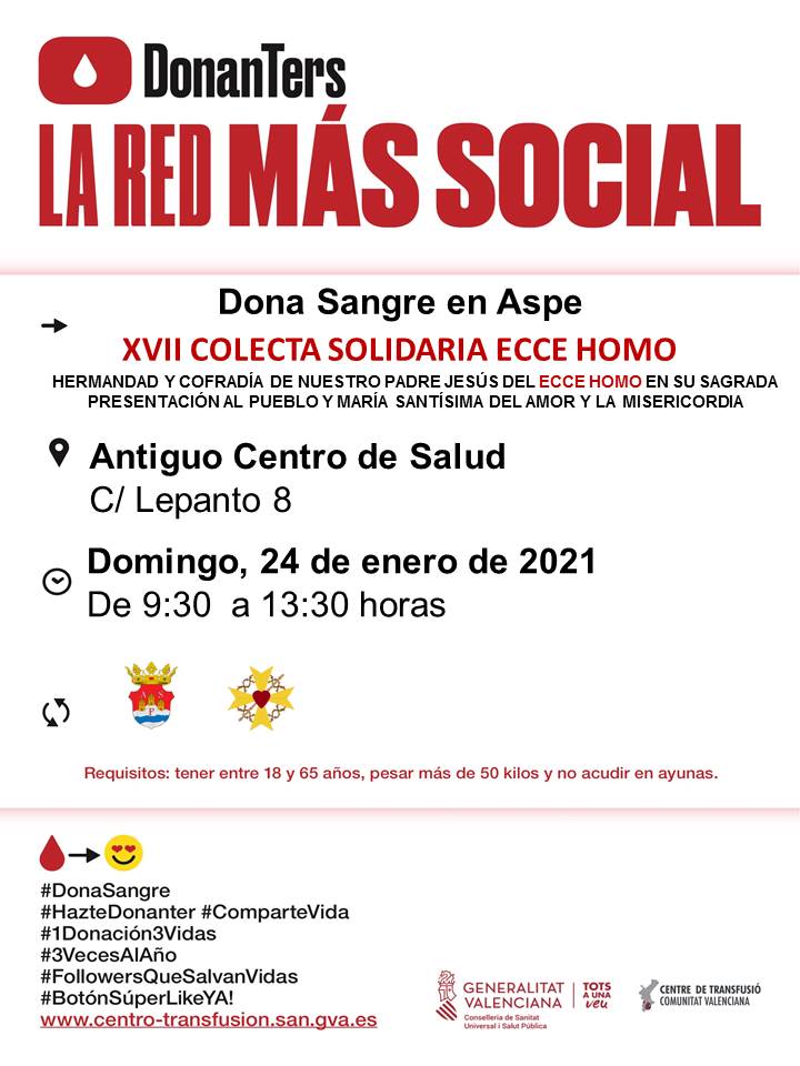 Como ya llevamos realizando durante 17 años, el próximo domingo 24 de enero de 9:30h a 13:30h tendrá lugar una nueva edición de la donación de sangre que organiza nuestra hermandad.